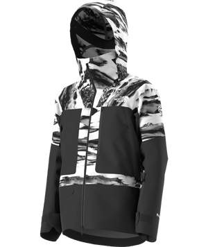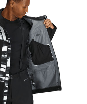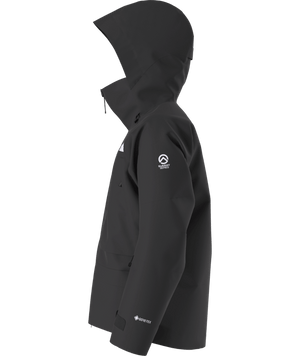 This jacket features a 3-layer GORE-TEX® shell made from 100% recycled polyester, offering exceptional waterproof and windproof protection while maintaining breathability. The articulated fit is tailored for dynamic movement, and the no-shoulder-seam design reduces bulk and enhances comfort when wearing a pack. The helmet-compatible hood with a bonded brim and cord-lock adjustment system ensures visibility and protection. Underarm vents with YKK® AquaGuard® FLATKNIT® zippers provide quick temperature regulation during high-output activities. Additional features include multiple pockets, such as alpine pockets with internal radio loops, a chest pocket with internal mesh pouch and cord routing, and two large internal mesh drop-in pockets. The jacket also features a fixed stretch powder skirt with silicone gripper tape and a jacket-to-pant integration clip, adjustable wrist cuffs with bonded hook-and-loop closure and integrated thumb loops, and an internal hem cinch-cord with a single-point adjustment and riveted cord lock.